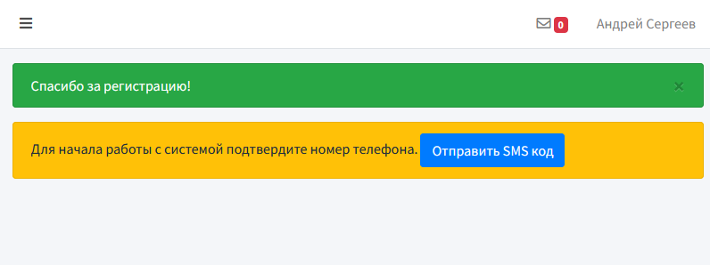 После успешной регистрации вы попадёте в личный кабинет, где в первую очередь вам необходимо будет подтвердить номер телефона. Для этого нажмите кнопку "Отправить SMS код".