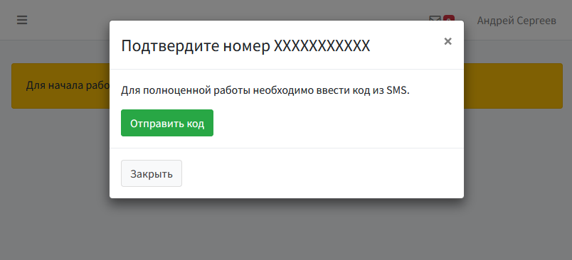 В открывшемся окне необходимо нажать кнопку "Отправить код". На указанный при регистрации номер будет отправлено SMS с кодом подтверждения, который надо ввести в появившемся поле.