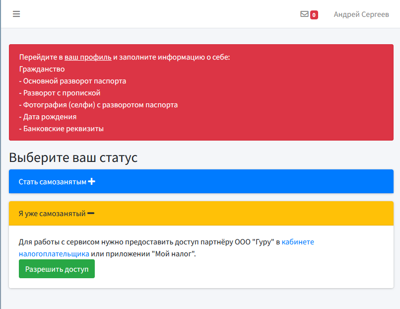 Для начала работы и получения заказов вам необходимо заполнить информацию о себе и подключиться к партнёру ООО "Гуру" в кабинете налогоплательщика или приложении "Мой налог". Если вы ещё не получили статус самозанятого, то можете ознакомиться с информацией, как стать самозанятым, расположенной на главной странице в разделе "Стать самозанятым".